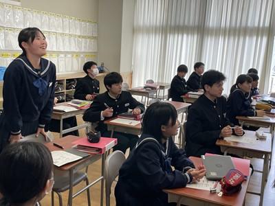 ・先生の話を聞き、自分の考えも発言しやすく、参加しているという雰囲気が良かった。楽しく授業を受けさせていただき、うれしい。(2年)