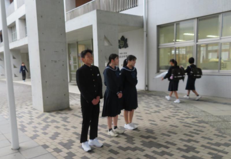 前期生徒会執行部が、毎朝ピロティに立ち、登校する生徒と気持ちのいい挨拶を交わしています。
