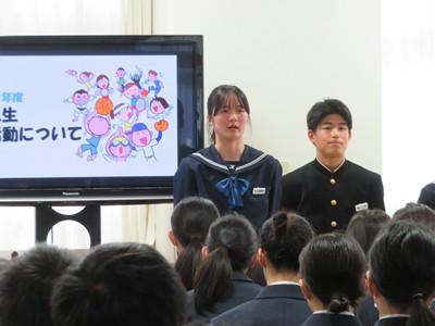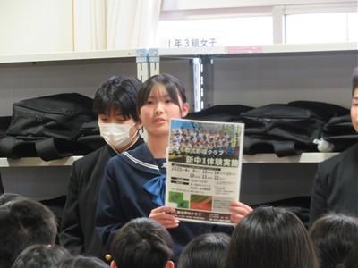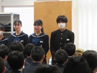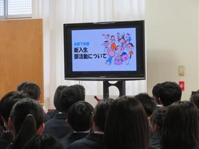 本日、1年生を対象に部活動紹介を行いました。各部の代表(部長、キャプテン)が1年生に対して、部活動を紹介しました。自分たちの部活動は、こんなことを目標に、どんな活動をしているか等、詳しく説明していました