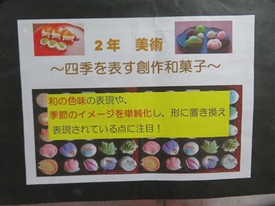2年生の美術の授業で、樹脂粘土を使って「創作和菓子」づくりに挑戦しました。現在、いくつかの作品が生徒玄関に展示されています。とても粘土で作られているようには見えず、ケースから取り出すと美味しく食べられそうな、本物の和菓子のように見える作品ばかりです。