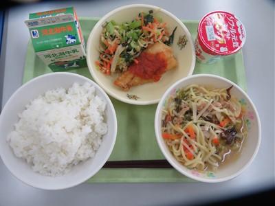 メニューは、白ごはん、チャーシュー麺、赤魚フライのチリソース味、小松菜と海苔のナムル、牛乳、そしてデザートにヨーグルトでした。ご飯やチャーシュー麺は温かく、作り立ての温かさです。味はとても美味しく、心もお腹もいっぱいになりました。幸せな気持ちで満たされました。