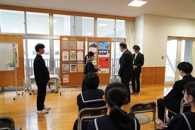 23日(金)、2年生は中学校体育館にて「地域企業との商品企画学習 発表会」を行いました。今回は、これまで2年生が多くの地域企業の皆様のご指導を仰ぎながら進めてきた「商品企画学習」の途中成果を発表する場でした。