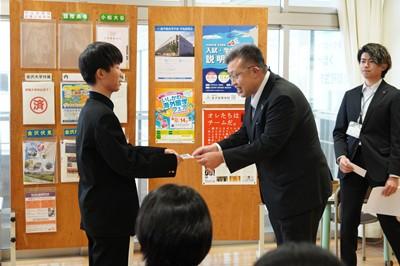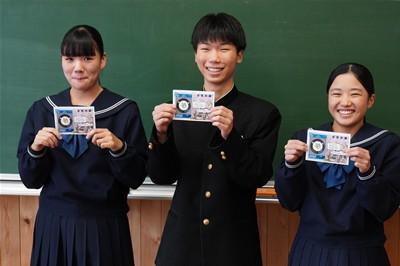 クラスを代表して、藤立さん、高鍬くん、森下さんがマンホールカードを受け取りました。