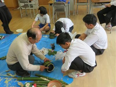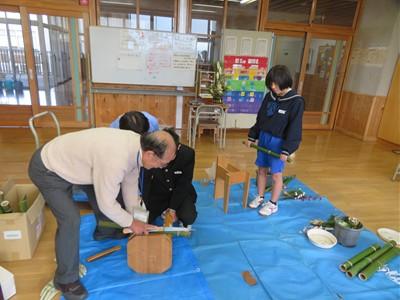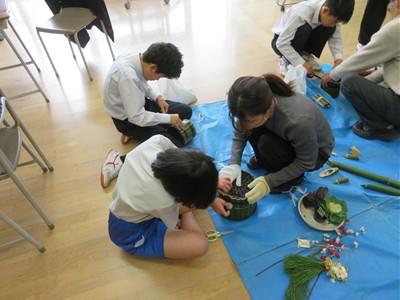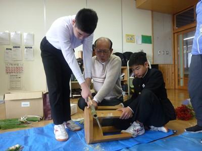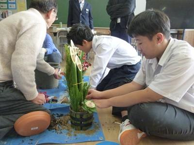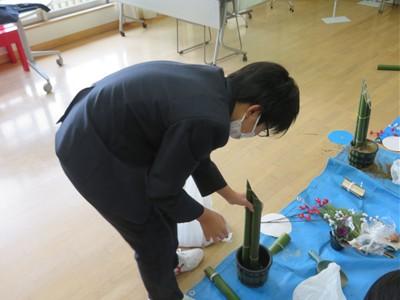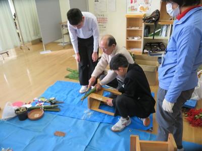 16日(火)午前中、シルバー人材センターの方(近谷さん)を講師に教えてもらいながら、ひより学級、わかくさ学級の生徒たちが門松をつくってくれました。