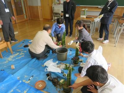 のこぎりで竹を切ったり、紙やすりで断面を滑らかにしたり、細かい手作業ですべての門松を生徒たちが作り上げました。最後は校長室にも門松を届けに来室し、校長先生と記念撮影しました。