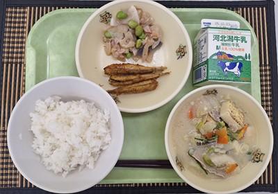 今日のふるさと給食メニューは「白ごはん」「豆乳とりやさいみそ鍋」「めぎすのから揚げ」「河北潟れんこんとベーコンのピリ辛炒め」「牛乳」でした。「豆乳とりやさいみそ鍋」には、地産食材として「砂丘長いも(角切り)」「ひらたけ」「河北潟れんこん」が使用されていました。「砂丘長いも」は、かほく市の大崎地区で育てられている長いもです。シャキシャキとした食感と、お汁の中で少しの粘り気を感じることができ、「とりやさいみそ鍋」の中で、しっかりとした存在感がありました。味だけでなく、食感で美味しさが倍増しました。しかも、とりやさいみそで、体もぽかぽかになりました。寒い季節はとりやさいみそ鍋も含め、鍋が恋しくなりますね。