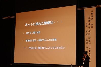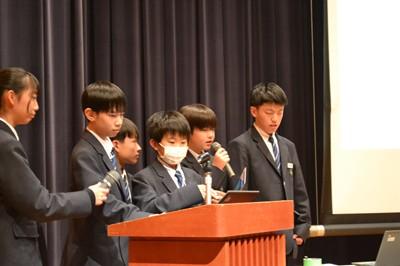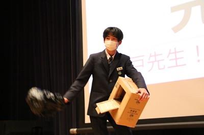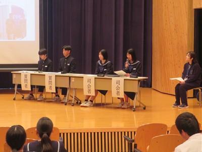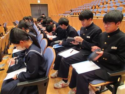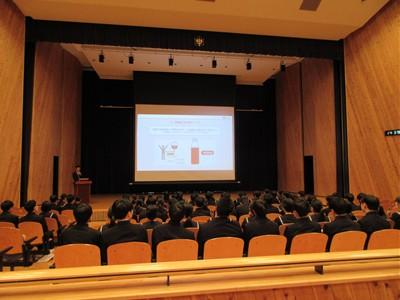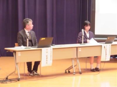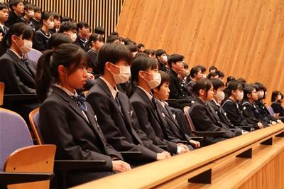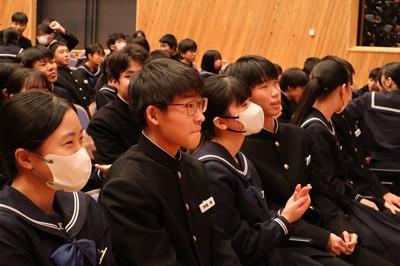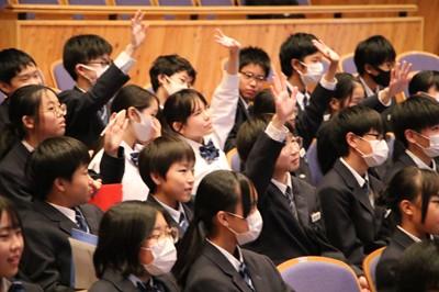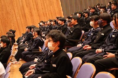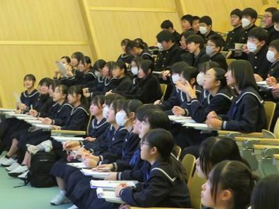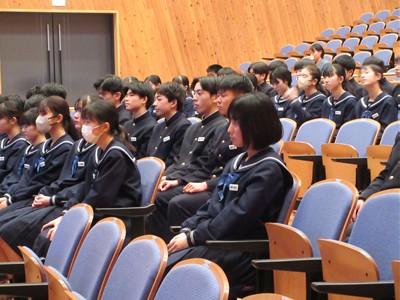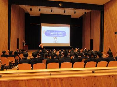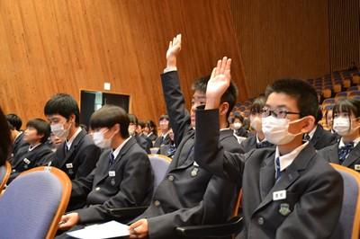 北村弁護士さんは、ニセ情報に騙されないよう、名誉棄損、人権侵害にあたるトラブルを起こさないよう、生徒の皆さんが犯罪や金銭トラブルに巻き込まれないよう、①正しく知ること、②よく考えること、③経験から学ぶこと、以上3点をアドバイスしてくださいました。最後は、生徒会長の太田さんがお礼の言葉を述べました。