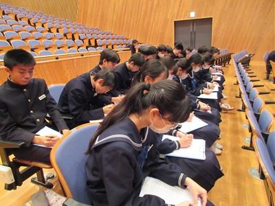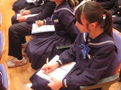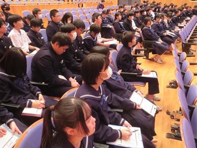 普通科のある県立高校のお話でした。2年生の中には、普通科高校への進学を希望する生徒も多いと思います。第1回目と同様、真剣な態度で教頭先生・先輩の話を聴いたり、説明スライドを見たりしていました。今回のお話も、とても刺激になりました。高校進学が近づいていることを実感した生徒もいたようです。