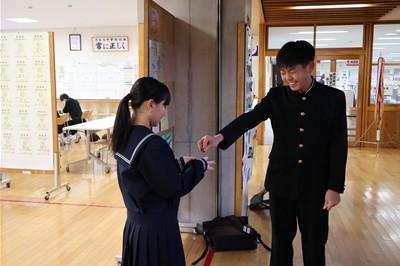 朝の登校時に生徒会役員が生徒玄関で募金を呼び掛けています。集まった収益金は能登の復興に少しでも役立ててもらえたらと思っています。