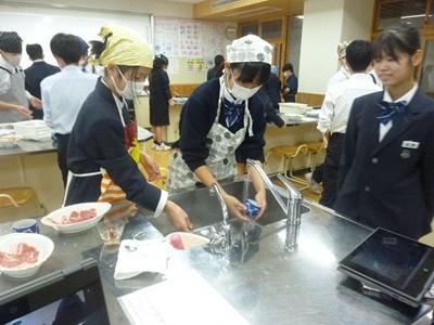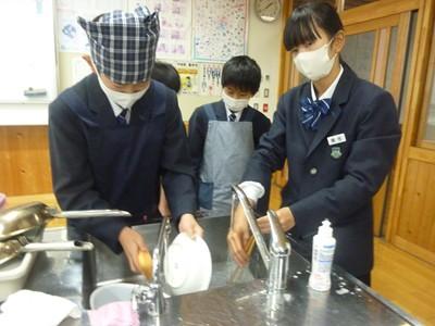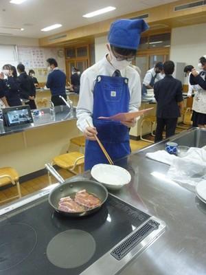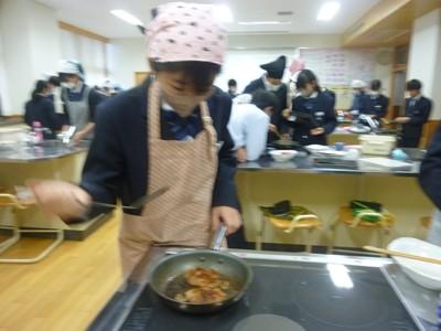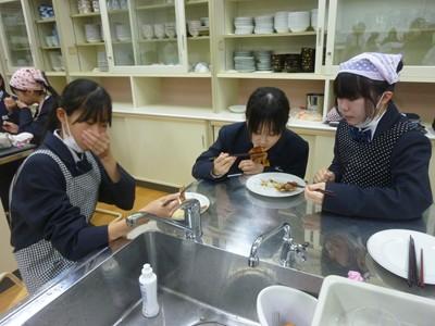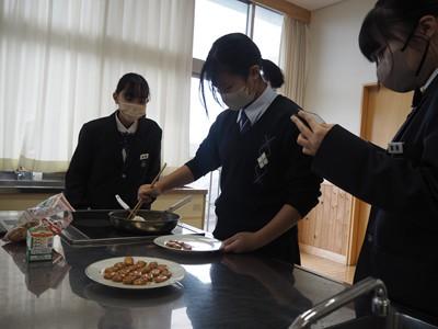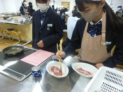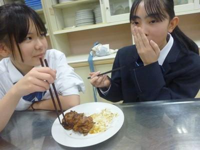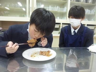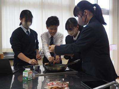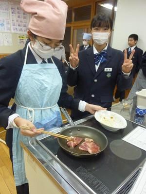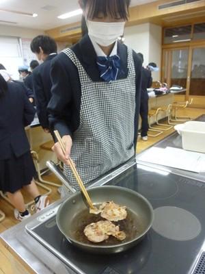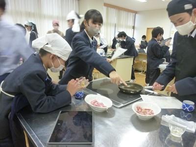 12月3日(水)午後、1年3組の生徒たちは、家庭科の授業で「豚しょうが焼き」を作り、自分たちで味わいました。一生懸命にショウガをおろす人、たれをつくり豚肉に下味をつける人、豚肉を焼く人、洗い物をする人など、それぞれが役割を分担し、最後には美味しい豚しょうが焼きを完成させました。