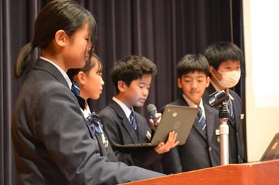 代表7グループによる発表会でしたが、講堂玄関ホワイエには、個人、グループで調べ、まとめた掲示物も展示され、参観者も掲示物に目を通していました。ここまで総合的な学習の時間で学んだことが形となって表されました。