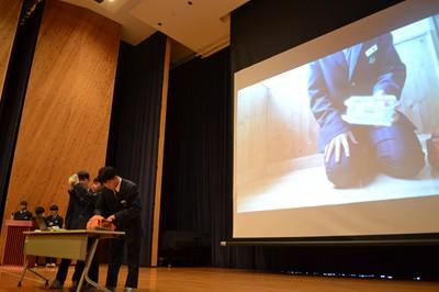 危険性を十分に理解したうえで、危険な誘いには強い気持ちで断る勇気を持ちましょう。健全な生活を送るため、健康な体をつくるため、正しい知識を持ち、正しい判断をしてほしいと思います。(会場が暗く、画像がはっきりせず、ご容赦ください)