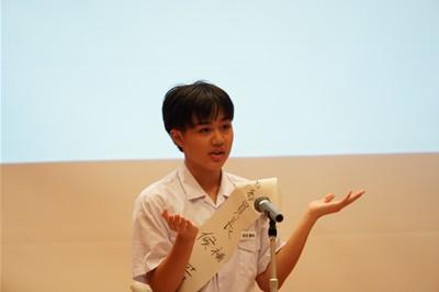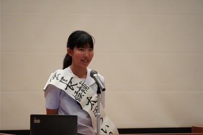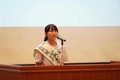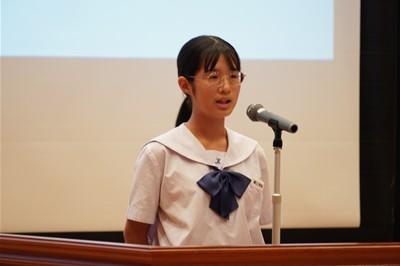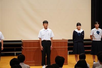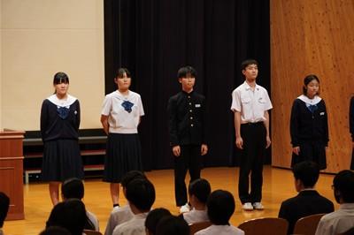 認証式の後、後期生徒会長の太田さんから全校生徒に向け、「より良い学校を目指そう」という強いメッセージが述べられました。さらに、後期の生徒会目標、合唱コンクールスローガンが発表されました。