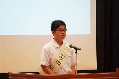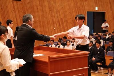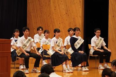 認証式に先立って、前期生徒会役員の解任式が行われ、前期生徒会長の油野くんから、全校生徒に向けて感謝の言葉が述べられました。生徒会役員、各委員会委員長は、前期の生徒会活動、委員会活動に対する全校生徒の協力に感謝していました。前期生徒会役員、委員長の皆さん、そして学級役員の皆さん、半年間お疲れ様でした。