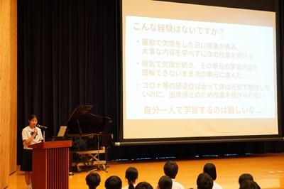 また、生徒会からは「いつでも、どこでも学習できる」オンライン学習について紹介がありました。