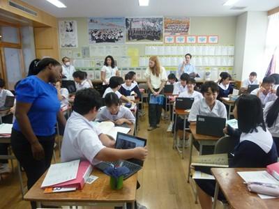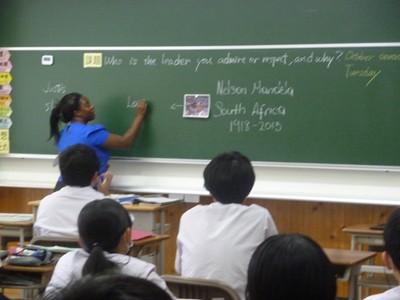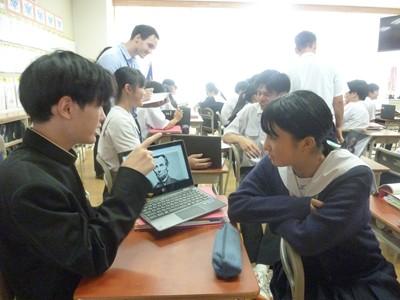 今日の授業課題は〝 Who is the leader you admire or respect, and why ? ” 生徒たちは選んだ人物の画像を見せながら、紹介と選んだ理由を英語で伝える活動に取り組みました。