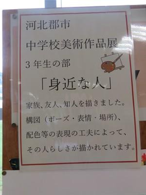 現在、生徒玄関ホールに、河北郡市中学校美術作品展(3年生の部)が行われています。