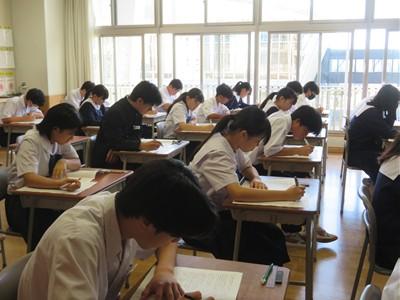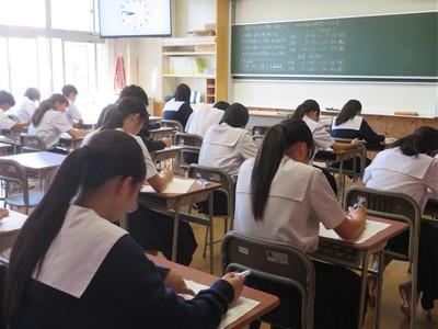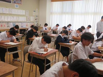チャイムが鳴ると一斉に問題用紙を開き、解答していました。とても真剣な様子です。3年生は統一テストが進路選択の際の大事な資料になることをわかっています。教室の中はカリカリと鉛筆が走る音だけが響いています。とても良い緊張感の中、真剣に取り組んでいます。