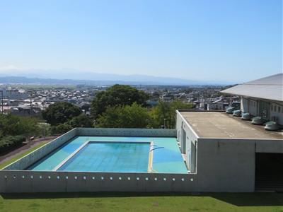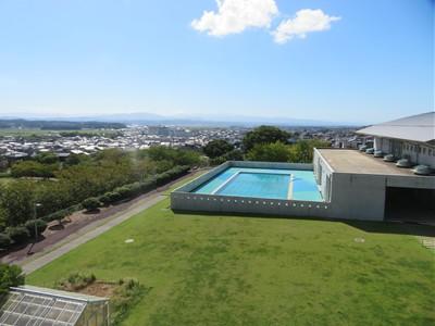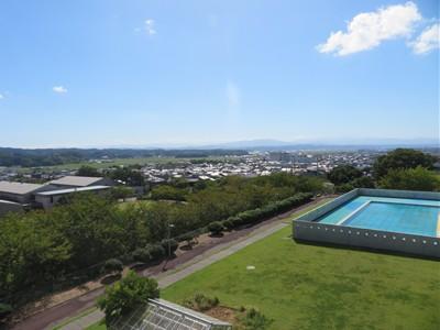 雲の少ない青空が青々とまぶしく輝いて見えます。秋らしい、すがすがしさを感じる景色が広がっています。3階から見ると、山の稜線が美しくはっきりと見えます。