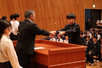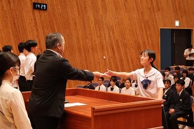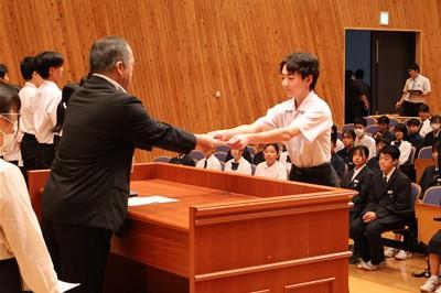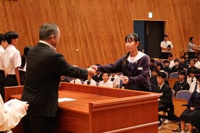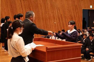 認証式では、後期生徒会長の太田あいりさんを先頭に、一人一人に対し、校長先生から任命状が授与されました。