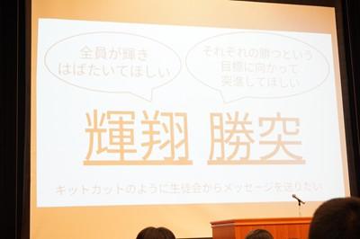 『輝翔勝突』(キットカット)です。生徒会執行部からは「全員が輝き、はばたいてほしい」「それぞれの勝つという目標に向かって突進してほしい」という2つの願いが込められています。ユニークな、ウィットに富んだ生徒会目標ですね。