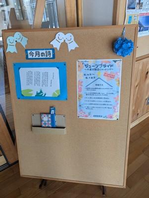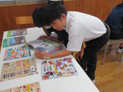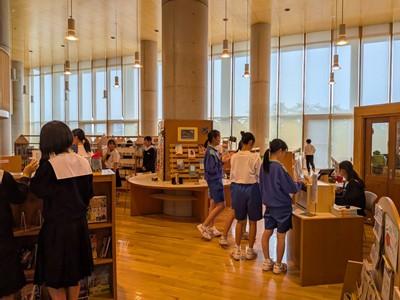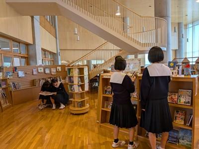 図書館は、誰でも、いつでも利用しやすいような雰囲気になっており、図書館前には掲示が充実し、本を読む生徒、読書好きな生徒が一人でも増えるような図書館企画・イベントも紹介されています。