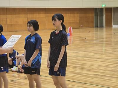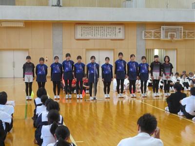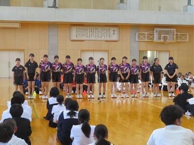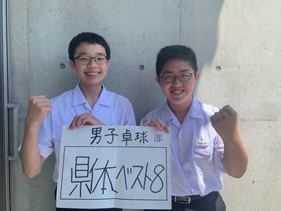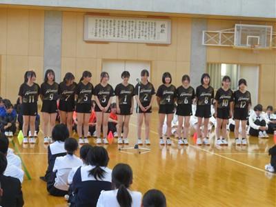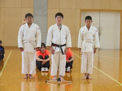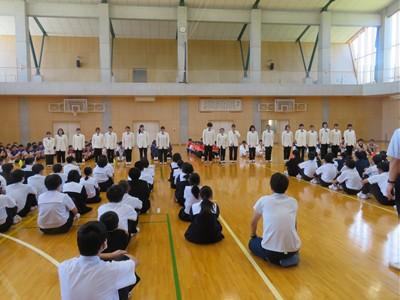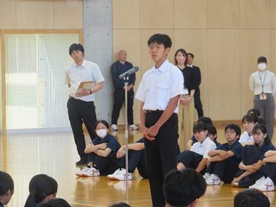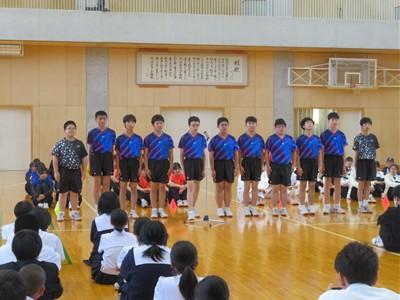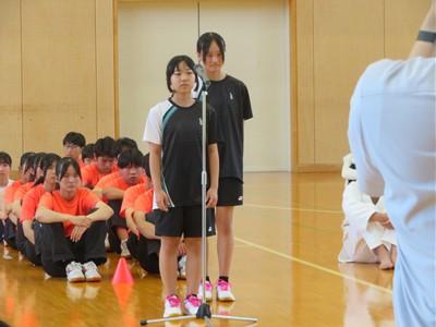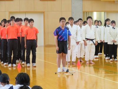 生徒会長の油野くんが生徒を代表して「だれかのためにがんばる。そして、自分のためにがんばる。」と応援メッセージを送りました。それに応え、選手を代表して男子卓球部主将の吉田くんが「各自が目標をもって取り組んできた成果を大会で発揮したい。応援お願いします。」と力強く述べました。