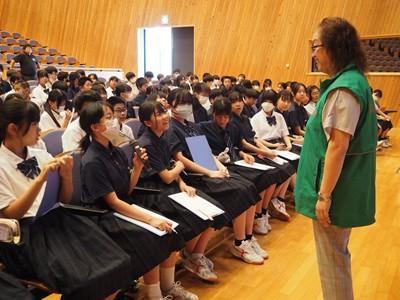 6日(金)午後、1年生は、講師に大月 真由美さん(日本防災士会 副理事長、公立つるぎ病院 看護師)をお招きして、防災講演会を実施しました。防災学習の一環として、避難所の設営・運営や地域防災について学びを深める目的で行いました。