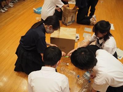 大月さんから、各クラスのプロ委のメンバーに「15分で、誰もが使いやすい簡易トイレを段ボールで作ってみよう」という課題が出され、実際に製作にチャレンジしてみました。