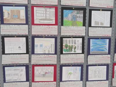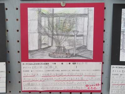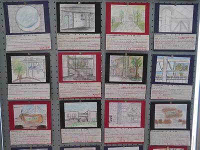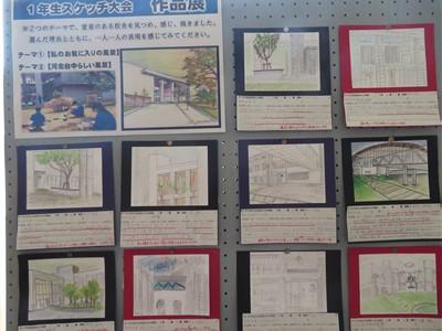 生徒玄関を入ったところに中央階段があります。中央階段の周りには生徒のがんばりが見える掲示がたくさん飾られています。