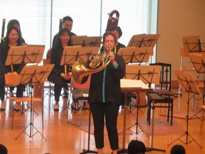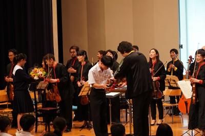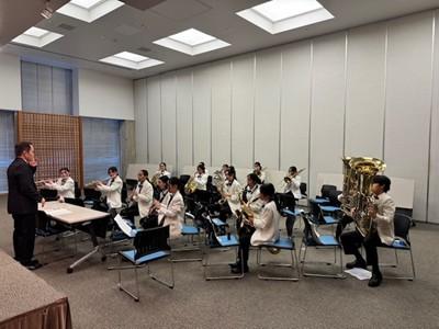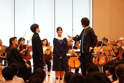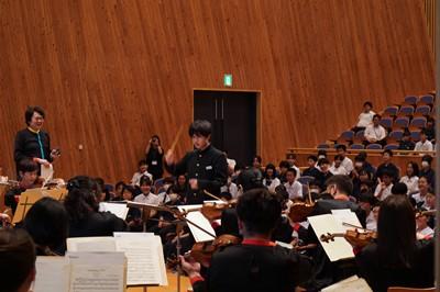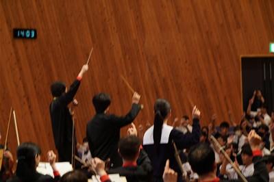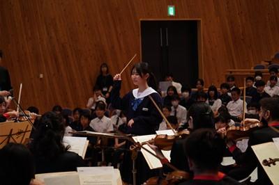 また、指揮者体験をさせていただきました。学校を代表して、吹奏楽部3年生の若吉さんと同じく3年生の大久保さんがオーケストラの指揮者にチャレンジしました。さすがに吹奏楽部の3年生でも、指揮をすることには慣れておらず、2人とも「とてもむずかしい。」と感想を述べていました。