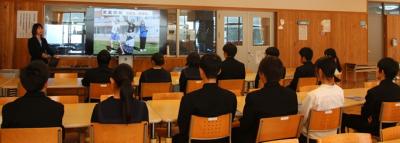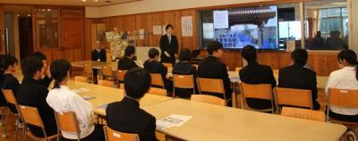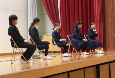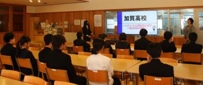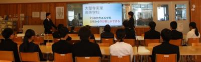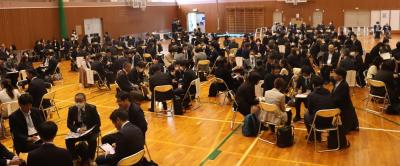9年生生徒とその保護者の方を対象とした高校説明会を行いました。加賀高校、大聖寺実業高校、大聖寺高校、小松大谷高校の先生方が来校し、それぞれの学校の特色や望まれる生徒像などのお話をしていただきました。どの高校も、生徒の自主性を大事にしていることや進路に向けて工夫して取り組んでいる様子などが、よくわかる説明会でした。9年生は、聞き逃さないよう集中していました。