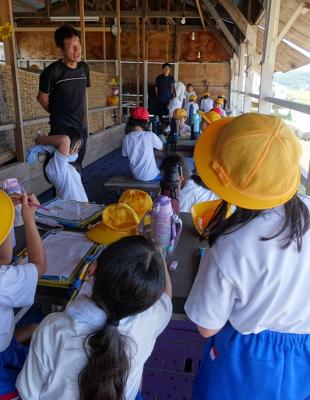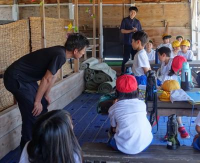 3年生が総合的な学習の時間に、地域学習の一環で地元の「やまは水産」を訪問しました。[橋立のカニを外国の方や都会の人にも広めて有名にしたい]というねらいで、カニの魅力を伝えるための動画づくりなど、表現活動に取り組むための調べ学習です。「カニの美味しい部分は?」「一日にどのくらいとれますか?」「お客さんに売る時の工夫は?」「お客さんのカニの一番人気は何ですか?」など、子どもたちは次々に質問し、丁寧に答えてくださる社長さんの言葉を聞き、一生懸命にメモを取っていました。