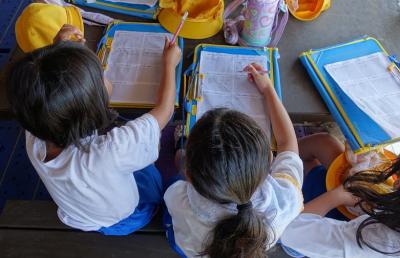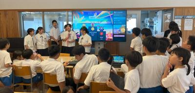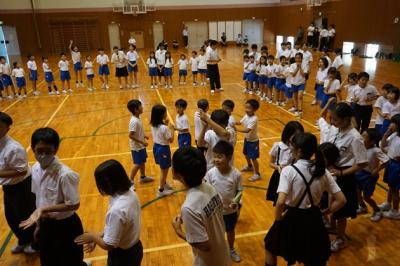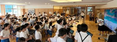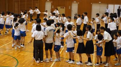 海友会は、前期課程と後期課程が仲を深めることを目的とした交流です。第1回は、生徒会執行部が企画した七夕に関するお題や国民的アニメについてのクイズをランチルームで行い、その後、第2講堂に移動してじゃんけん列車を行いました。昼休み中でしたが、ほとんどの児童生徒が参加し、学年を超えて仲良く交流する素晴らしい姿が見られ、大成功でした。