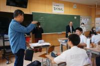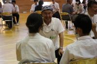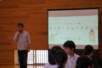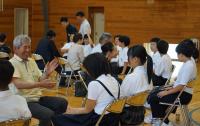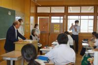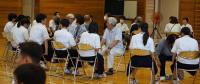 学校の「非行被害防止講座」と地域の「橋立っ子を育てる会」を併せて、トークフォークダンスを行いました。地域・保護者から33名の大人が参加してくださり、6~9年生60名と共に、大人1名と児童生徒2名のグループをつくり、司会進行のお題に沿ってお互いの考えを話したり聴いたりしました。お題ごとに大人の方々が時計回りに交代され、フォークダンスのように相手を変えて話し合いました。年代を超えて考えを聴き合うことで、お互いを理解したり、子どもは将来のことについて考えたりする機会となったり、大人にとっても子どもにとっても有意義な体験となりました。