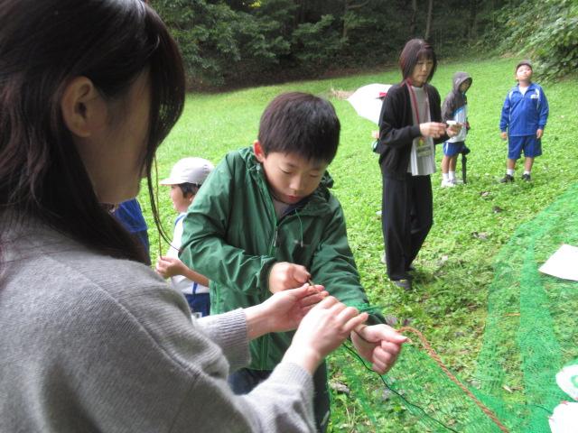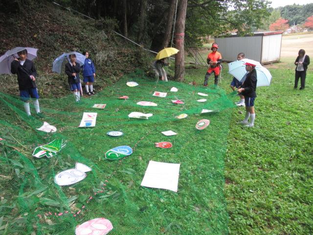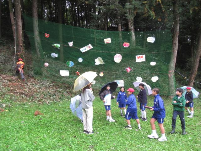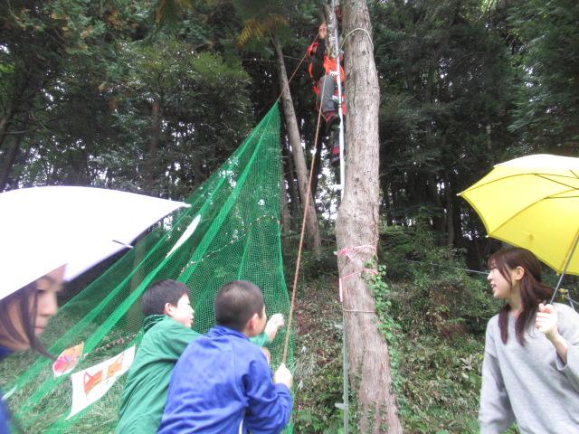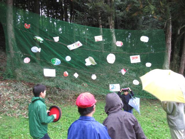 総合的な学習の時間に、金津の森にみんなが遊べるものを作りたい!との思いで、計画してきた的当てがが完成しました。金沢森林組合の高野さんにご協力いただいて、4年生の願いが形となったのです。金津の森の背の高い2本の木に、4年生が試行錯誤をしながら作成してきた的をつるしました。的が高く上がったときには「わぁ!やった!」と歓声があがりました。完成した的当ては、金津の森フェスティバルで披露します。