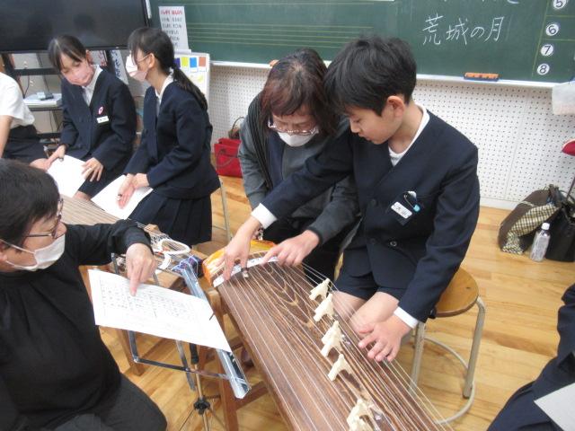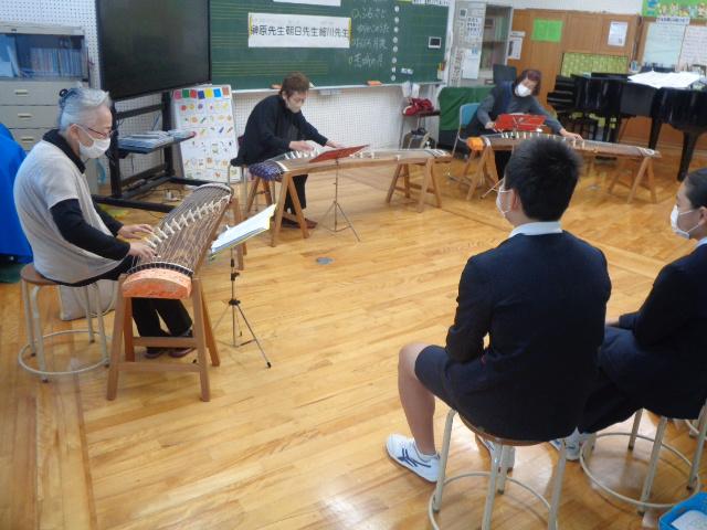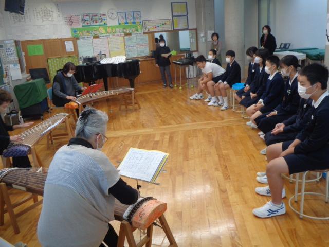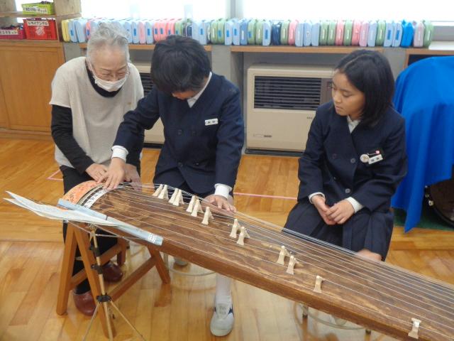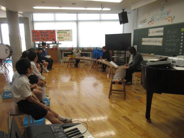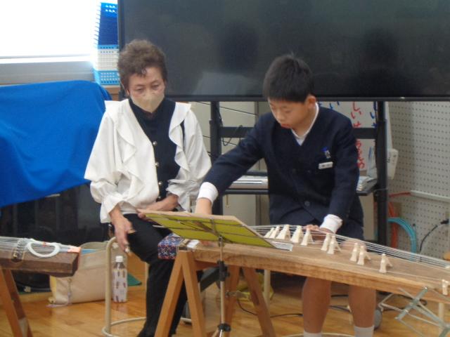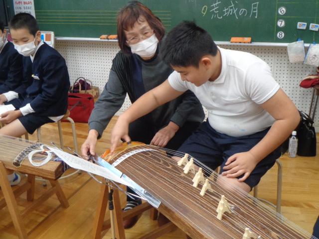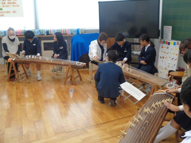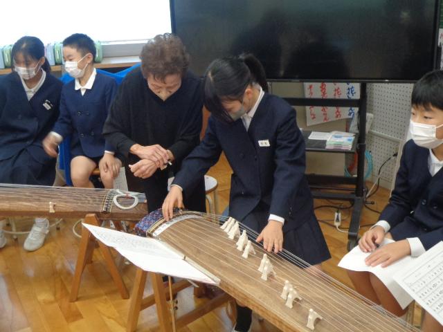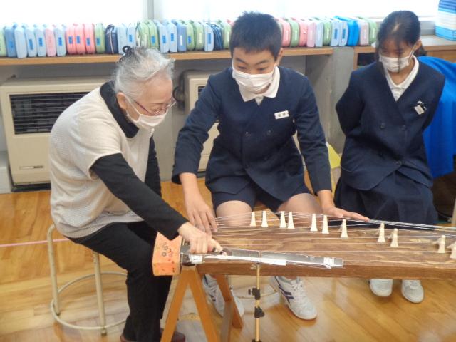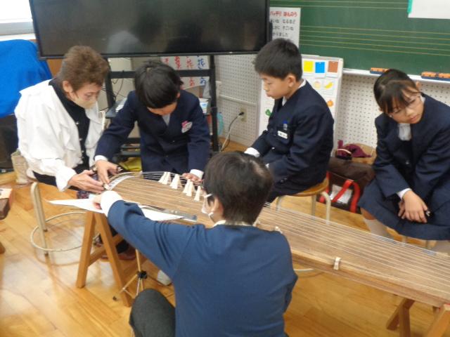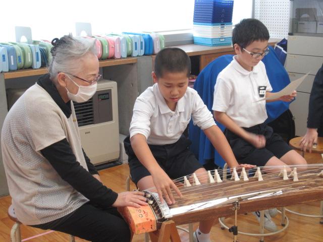 3名の講師の方々に来ていただき、箏の演奏体験をしました。昨日は4年生が、今日は5年生と6年生が体験しました。初めに、「七つの子」「もみじ」や「赤とんぼ」「ふるさと」などの学年に応じた曲の演奏を聴かせてもらいました。箏特有の音色に聞き入っていました。次は、「爪」をつけて、自分たちが演奏の練習をしました。曲名は「さくら」です。楽譜は漢数字で書かれており、それを見ながら弦をはじいて演奏していました。爪で弦をはじくのが難しい様子でしたが、最後には「さくら」の演奏ができるようになりました。箏という日本の伝統的な楽器に触れる貴重な体験をさせていただきました。講師の先生方、ありがとうございました。。