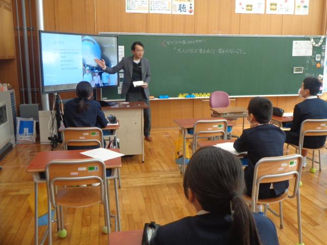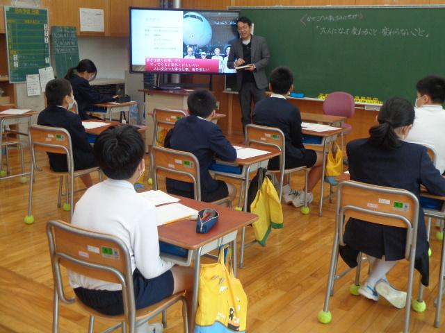 NEDO(「国立研究開発法人 新エネルギー・産業技術総合開発機構」)から谷田様を講師に迎え、「大人になって 変わること・変わらないこと」をテーマに、話を聞きました。航空機を造るにあたって大事なことは素材や重量など様々ありますが、日々研究を重ねて新しいものを開発しているそうです。谷田さんは、ご自分の経験から「夢とは違う仕事、でも やってみると意外とおもしろい 人に役立つ大事な仕事、毎日楽しい」というメッセージをくださいました。将来の夢はまだもてていない子はいますが、将来何かやってみようという気持ちをもつことの大切さを感じることができたようです。