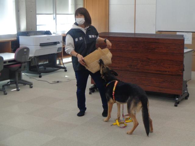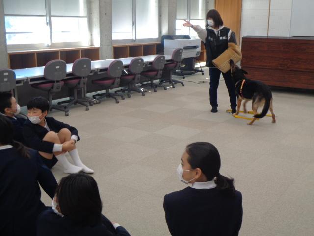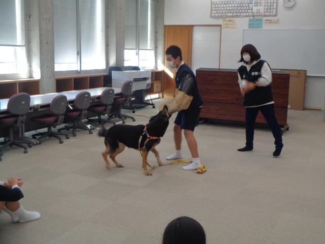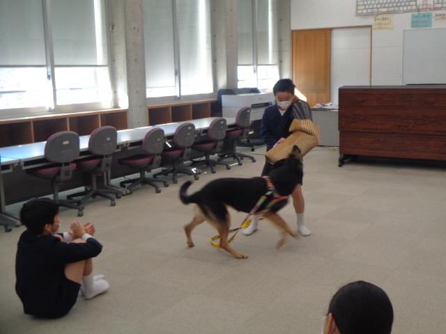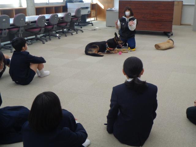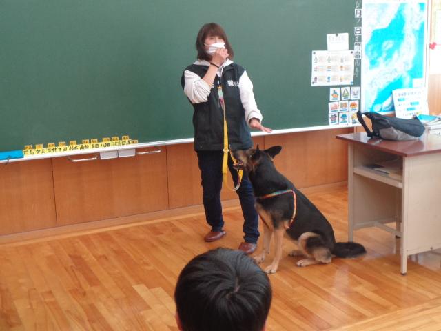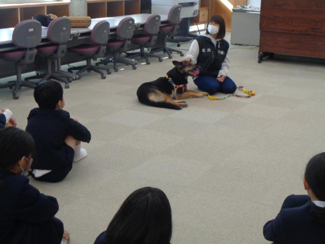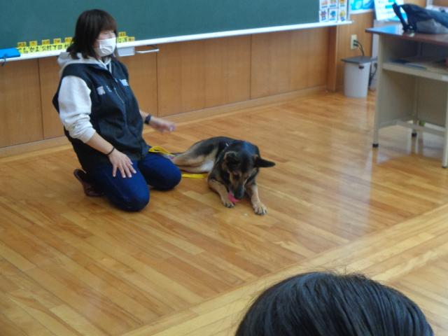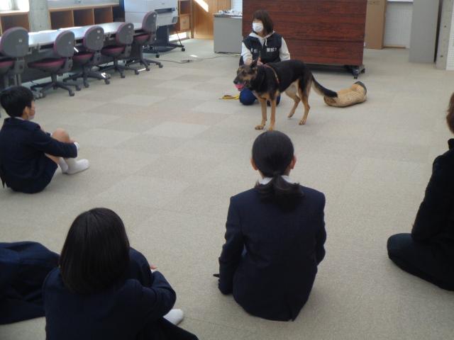 6年生のキャリア教育で、「犬の学校MIKA」の赤崎美香先生とマーブルちゃん(警察犬)に来ていただきました。赤崎先生は、犬の訓練士であります。ご自分が、どうして犬の訓練士となったのか、これまでマーブルとどんな仕事をしてきたのか、どんな気持ちで仕事をされているのかなどの話を聞くことができました。また、マーブルちゃんとの体験学習もさせていただきました。警察犬であるマーブルちゃんは指示通りに行動します。吠えたり噛んだり横について歩いたりする姿が立派でした。そういう犬に育てる訓練士という仕事があるということを初めて知ることができました。