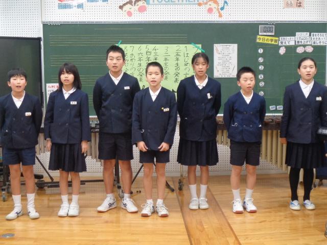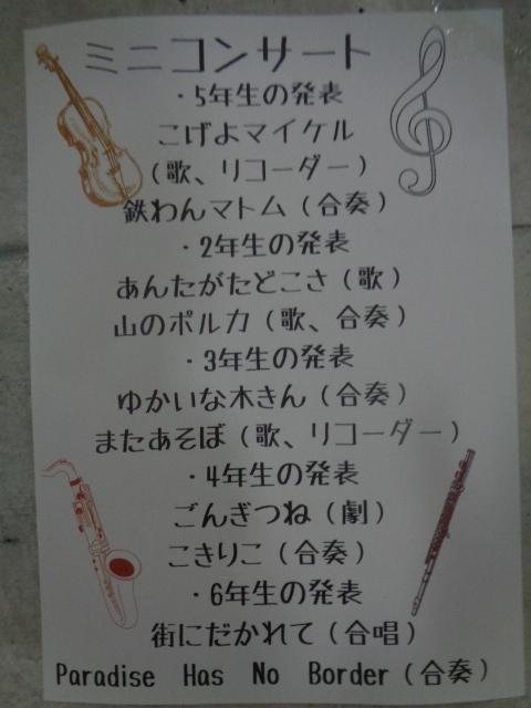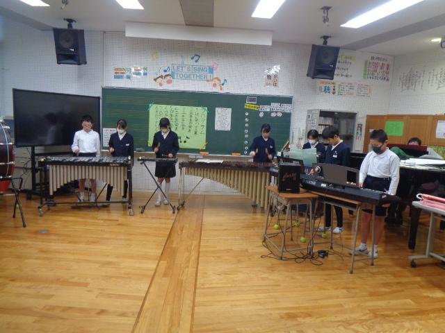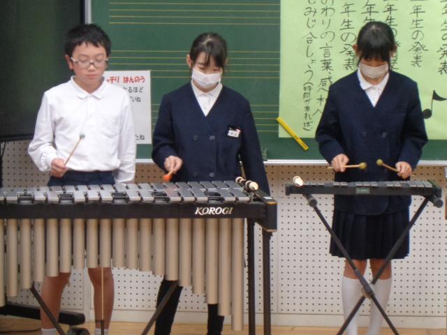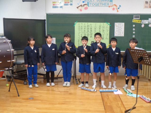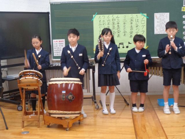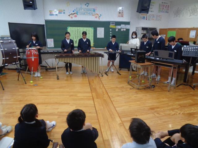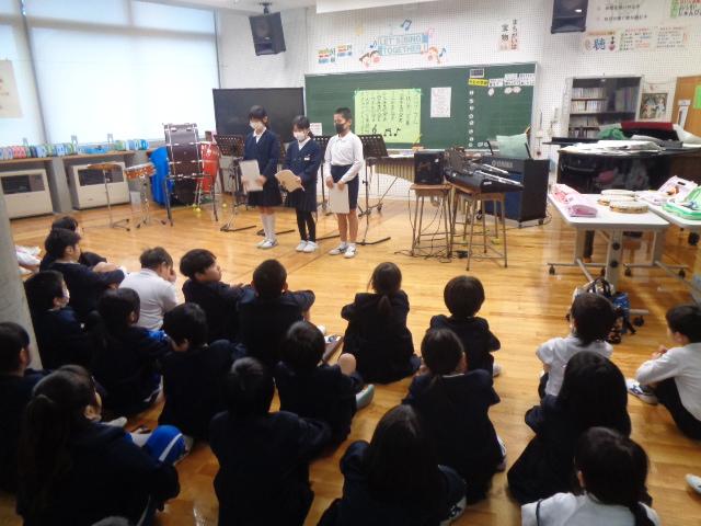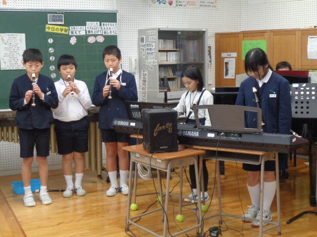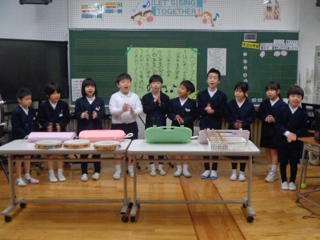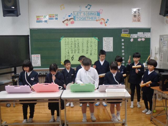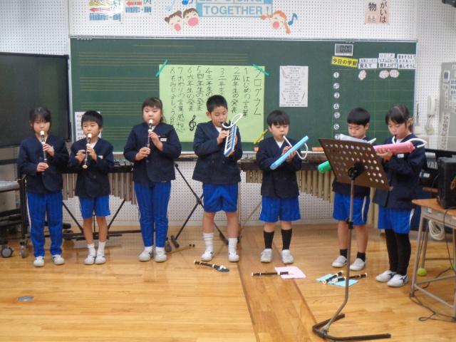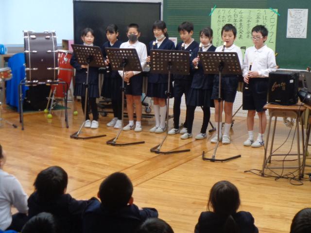 全校児童が集まってミニコンサートをしました。各学年で2曲ずつの合唱や合奏、オペレッタを発表しました。聴いている人たちは、演奏している曲に合わせて手拍子をするなどして参加し、楽しんで聞くことができました。感想タイムでは、たくさんの子供たちが手を挙げ感想を話していました。最後は、全員で「もみじ」を歌い、美しいハーモニーを響かせていました。外は寒いですが、音楽室は温かい空気に包まれていました。