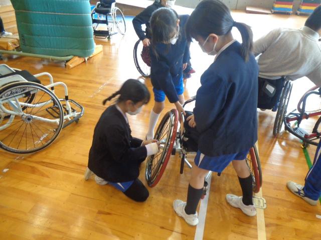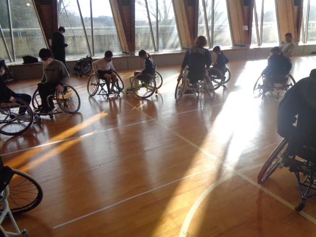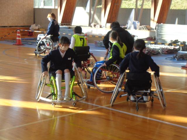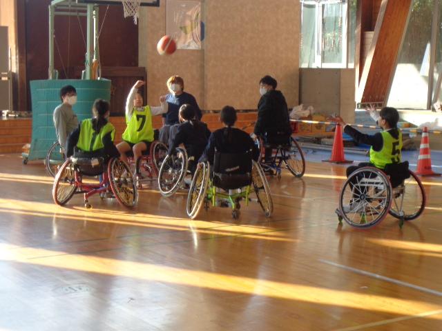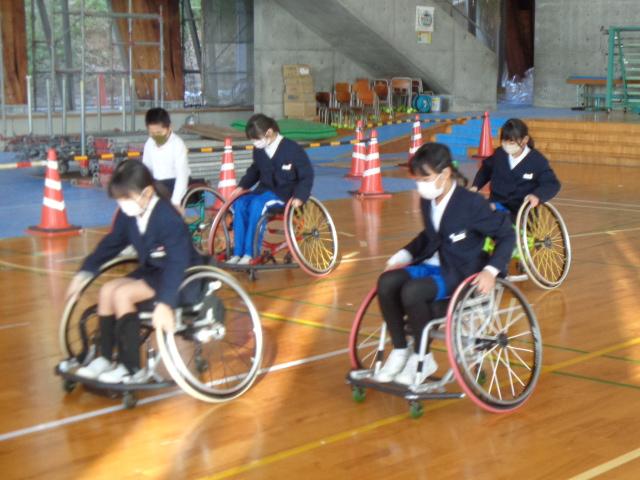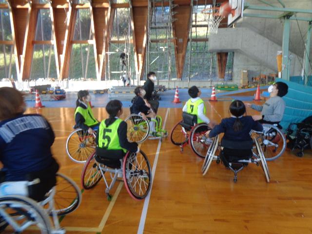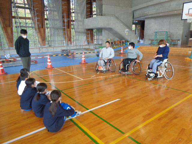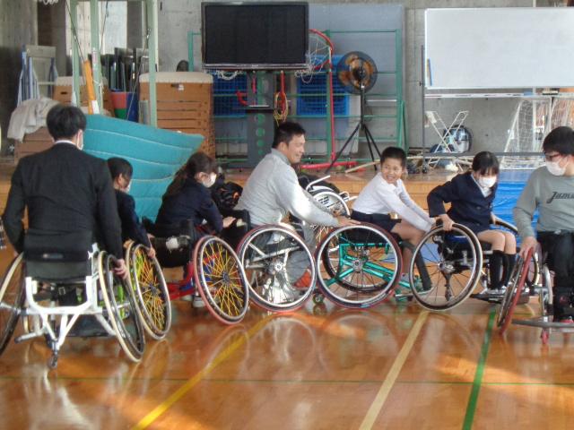 車椅子バスケットボールチーム「Jamaney石川」から3名の選手の方々に来ていただき、車椅子バスケットボールを体験しました。はじめに、3名の方々の自己紹介でした。どうして車いすを使うようになったのかを話してくださいました。その後は、子供達も車いすに乗って、走る練習や曲がる練習、リレー、ボールを使った運動をしました。いよいよバスケットボールです。ボールを扱いながら車椅子を動かすことはとても難しいですが、楽しんで体験していました。最後の質問タイムでは、「大変なことは何ですか?」と尋ねる子がいました。誰しも大変なことはある。それを大変だと思うのか思わないのかは本人次第と。子供達も生活の中で大変なことはあると思うのですが、それを大変なことだと思わないで取組んでほしいと思いました。明日は4年生が体験します。