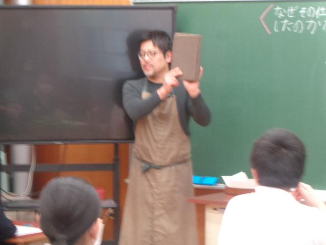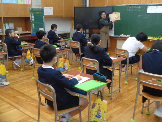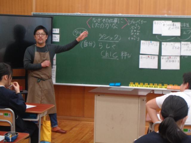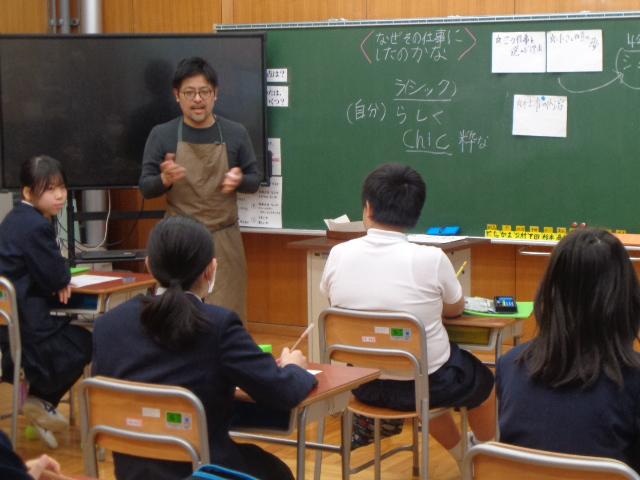本校出身のフランス料理シェフ、榊原さんに来ていただきました。榊原さんは、4年生の時の日記の中に、「将来は、フランス料理のシェフをやっている」と書いていたそうです。いろいろな仕事を考えたらしいですが、現在は、シェフとして金沢に「ラシック」を構えていらっしゃいます。授業では、シェフとはどんなことをしているのか、挫折を感じたこと、ターニングポイント、嬉しかったことなどを話してくださいました。中でも、どうやったらお客さんに喜んでもらえるのかを考え、お客さんが喜んでくれたことがやりがいとなっているという話を聞いて、子供たちは、榊原さんの仕事への思いや大切にしていることを感じ取っていたようでした。