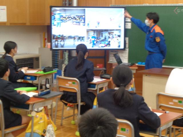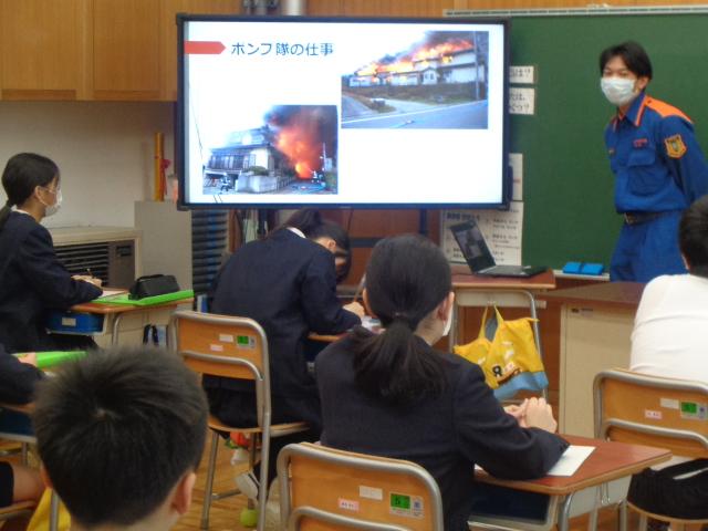 昨日に続いて、今日は、消防士の山森さんに来ていただきました。消防士になった動機、消防士の一日の仕事、仕事をしていてよかったことや辛く感じたことなど、たくさんお話していただきました。消防士になってよかったことは、感謝されることが多いこと。その度に誰かの役にたったと実感し、それがやりがいとなっていると話されていました。夢は、災害の少ない安心して暮らせる市をつくること、市民のみなさんに信頼される消防士となり多くの人を救うことだそうです。6年生の心に響きました。