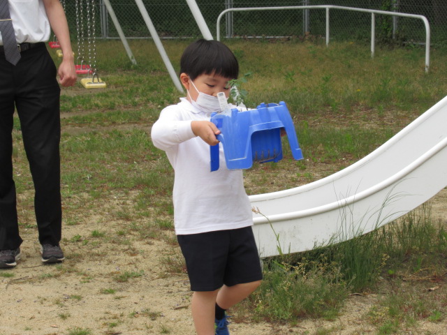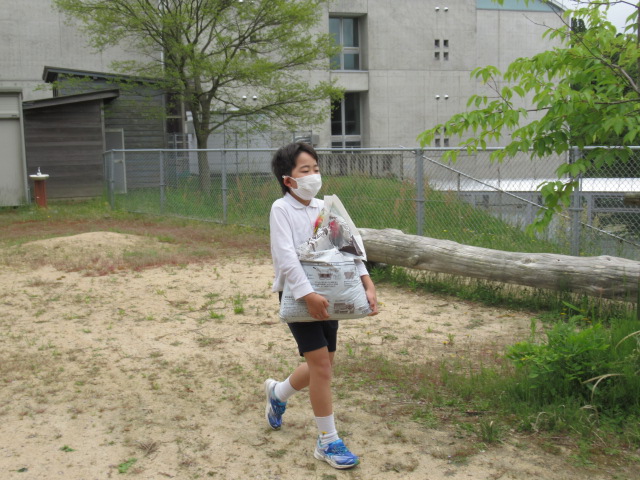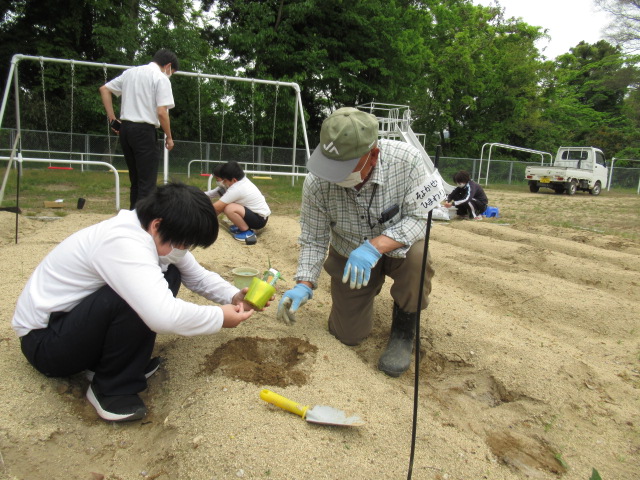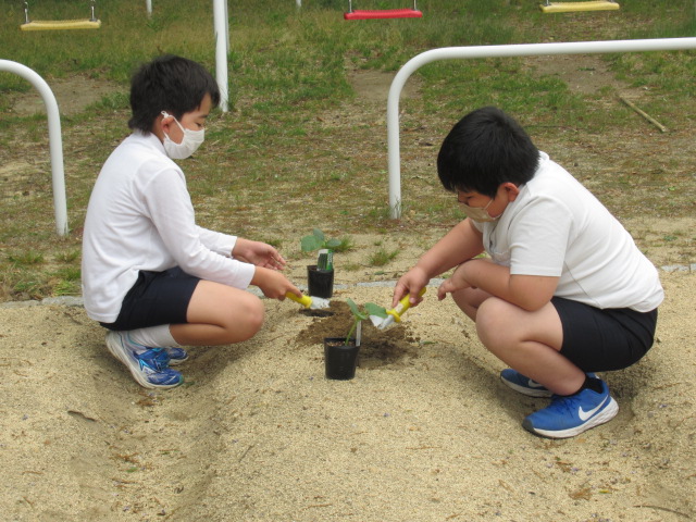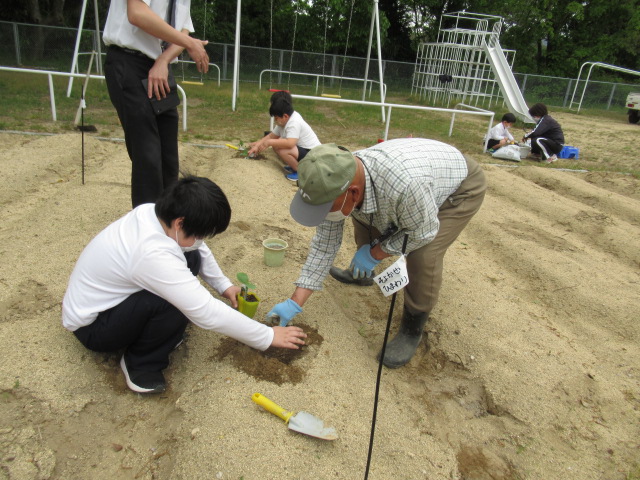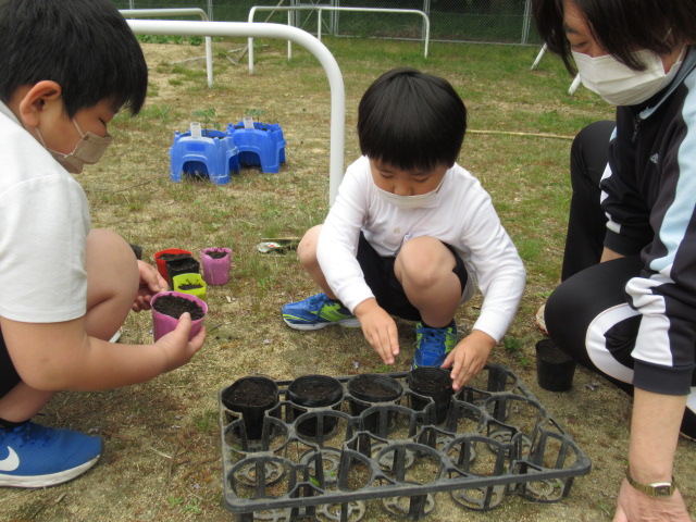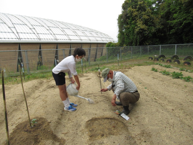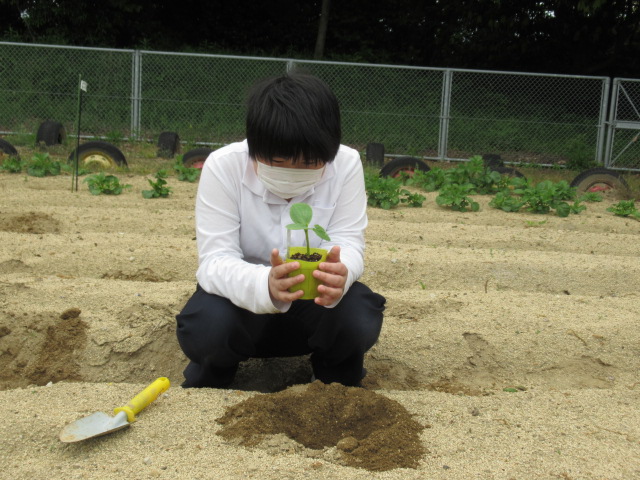 そよかぜ・ひまわり学級の4名は、畑の先生・西東さんに指導していただきながら、畑仕事をしました。キュウリとミニトマト、そして今年度は新しくカボチャの苗を植えました。カボチャを育てるには畝を広く使わなければならないのだと、自分たちで予習した内容を西東さんに披露しました。また、落花生と枝豆は種をポットで育てます。みんなで協力してポット作りもできました。野菜の成長が楽しみですね。