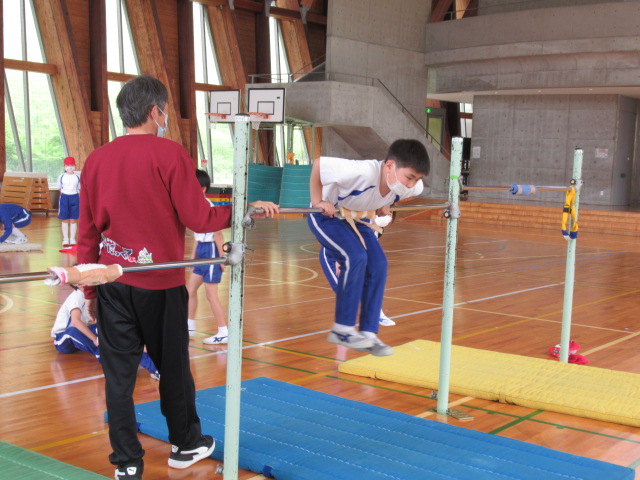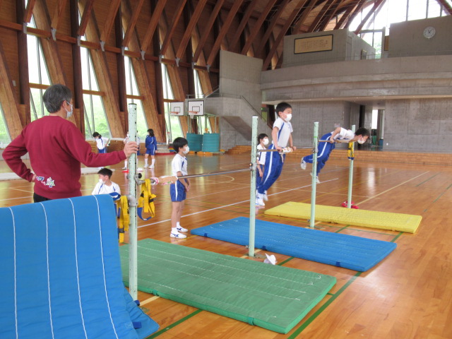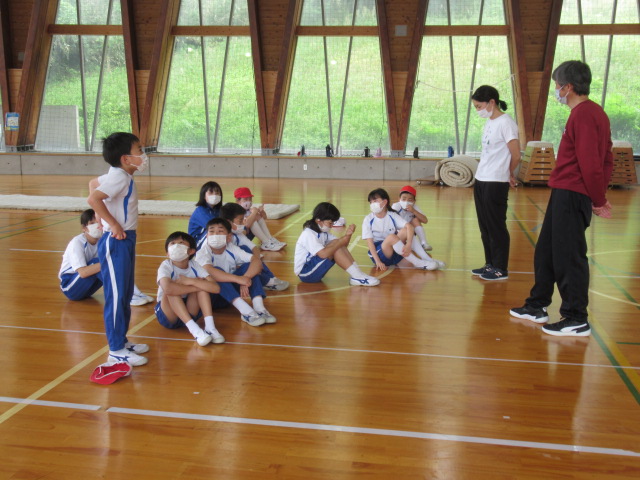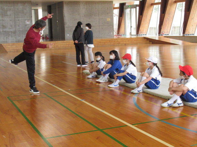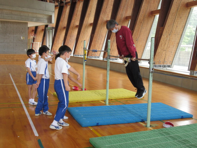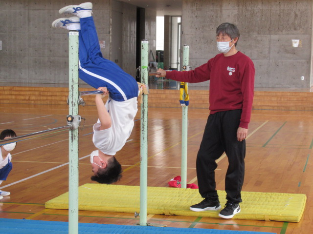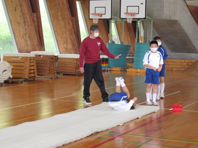 かほっくる館長の西田健一さんに、器械運動の指導をしていただきました。今日は鉄棒とマット運動です。マット運動ではしっかり足を伸ばすことや、鉄棒では振り子で降りる時にかけていない足を振ることなど、具体的にわかりやすく教えていただき、子ども達は一生懸命練習に励んでいました。