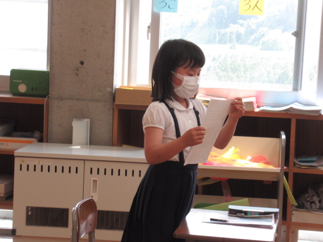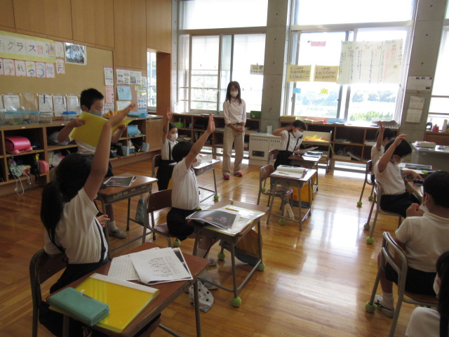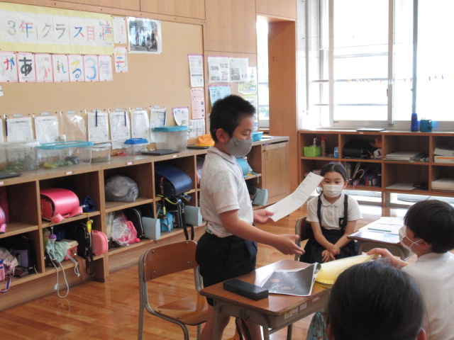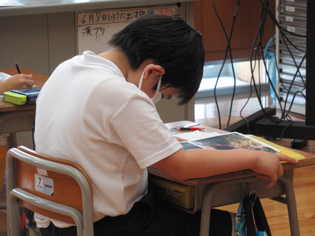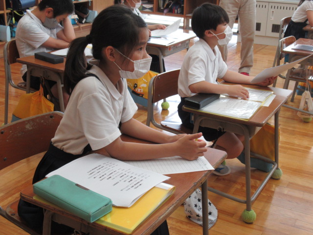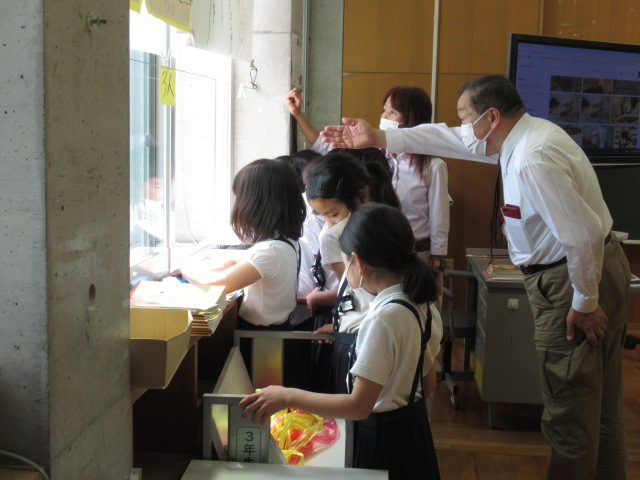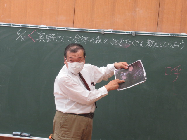 6月8日、奥野清光さんに金津の森について教えていただきました。事前にお渡しした質問について、手作りの資料を用いて丁寧に説明してもらいました。森が整備された流れや、当時のたくさんのPTAの方々の協力があったことを学ぶことができました。森と林の違いについてもお話していただきました。また、児童一人ひとりが奥野さんに、金津の森の整備でお願いしたいことを伝えました。金津の森をパーティーができる森にするために子ども達も、森に落ちている枝を拾うなど、できることからしていくことを約束しました。