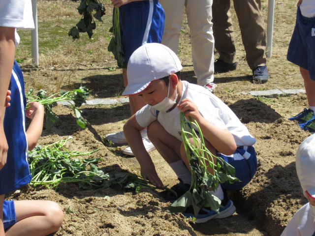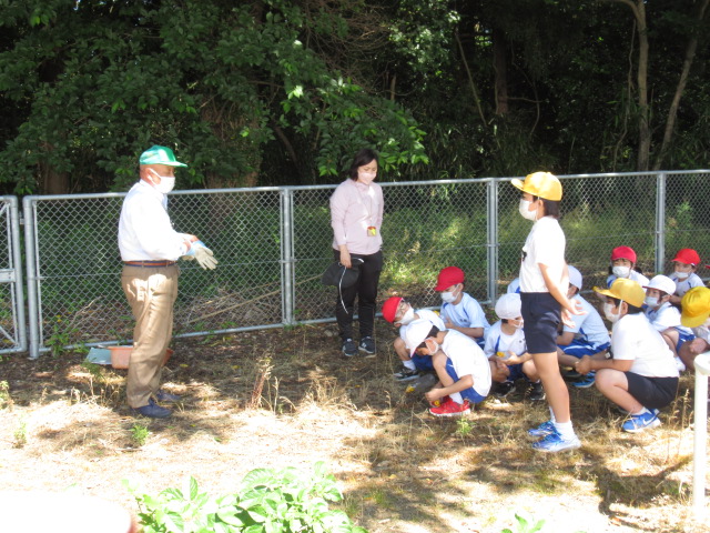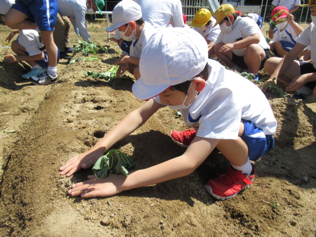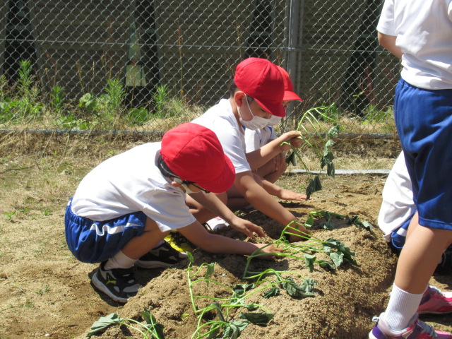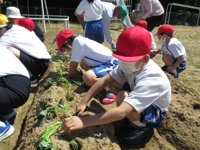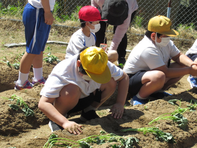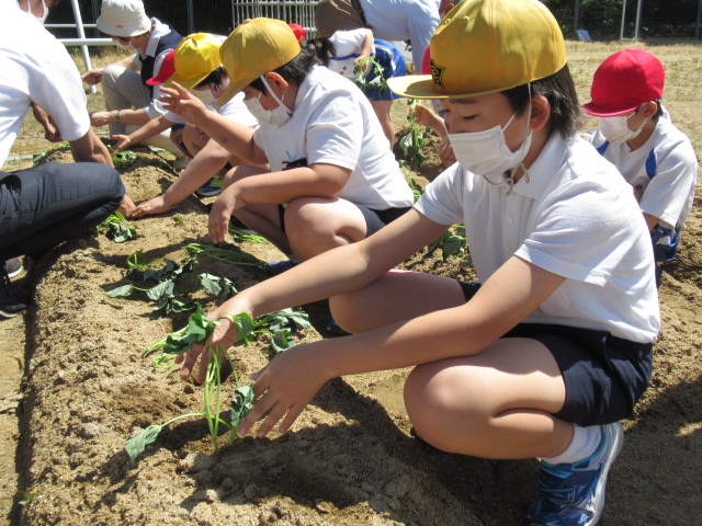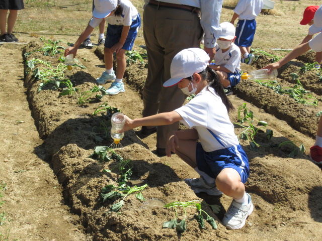 6月9日、西東輝雄さんにご指導いただきながら、1・2年生とそよかぜ・ひまわり学級合同で、喜綿農園からいただいたかほっくりの苗植えをしました。そよかぜ・ひまわり学級の高学年の児童は慣れた様子で上手に植えていました。2年生は先日喜綿農園で植えた経験を生かして、わからないところは西東さんに聞きながらしっかりと植え付けました。1年生も、上級生や西東さんに教えてもらいながら一生懸命植えました。水やりの頻度も教えてもらって、子ども達みんな、苗のお世話へのやる気がみなぎっていました。