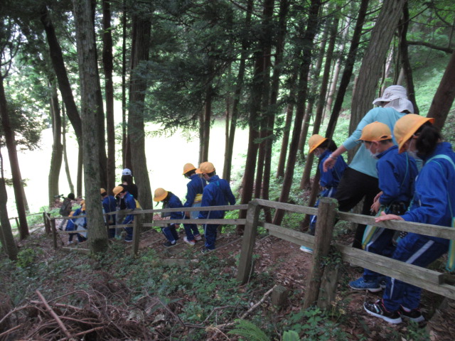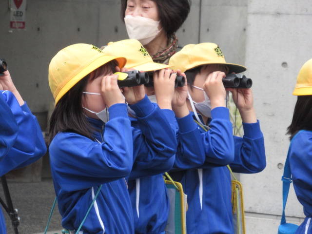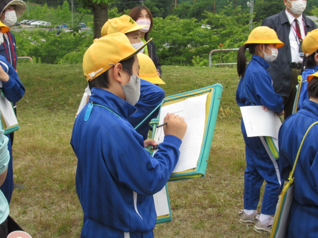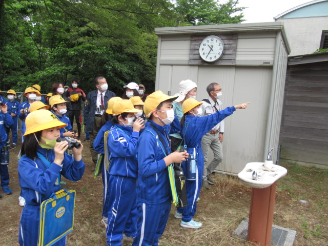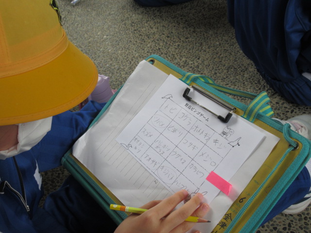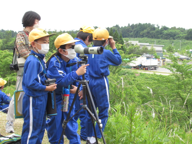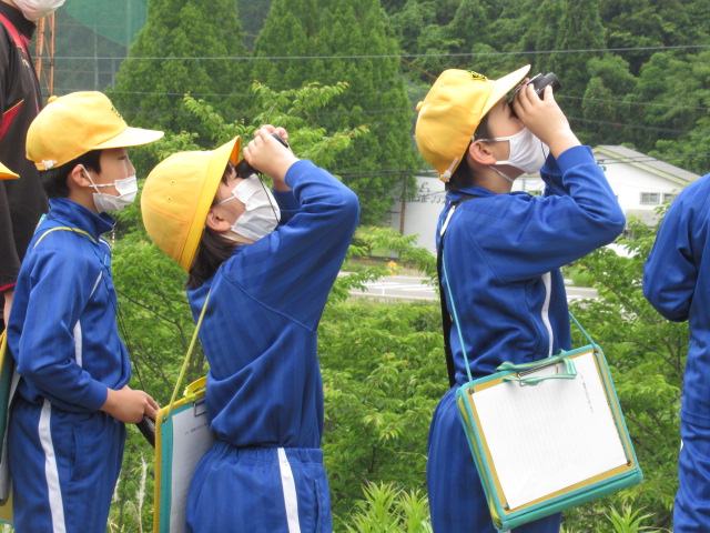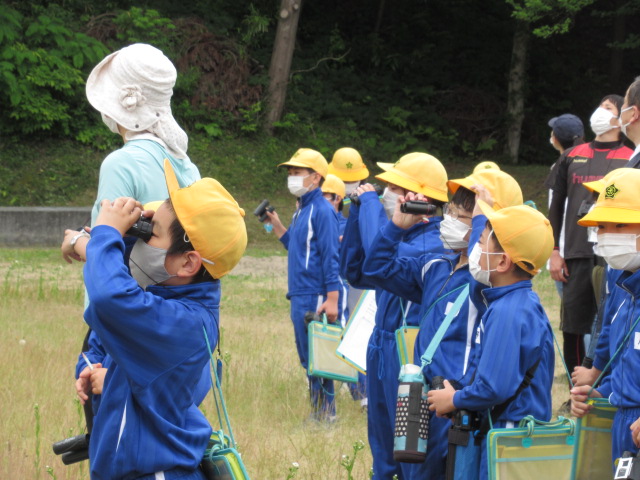 金津の森プロジェクトの、3・4年生対象の「森はすごい」。今年度は野鳥の観察を行いました。講師に白川郁栄先生(野鳥の会石川支部副代表)をお招きし、双眼鏡の使い方を教わった後、学校の周りを歩いて観察の練習をしました。スズメやカラス、ヒヨドリ、コサギなどを見つけることができました。金津の森の中では、針葉樹が多いため、あまり野鳥を見つけることができませんでしたが、木と鳥の関係を学ぶことができました。また、マラソンで使っているコースにオオヨシキリが住み着いており、講師の白川先生からは、「オオヨシキリの鳴き声が聞こえるなんて、すばらしい学校です」と教えていただきました。観察後は、見つけた野鳥の名前でビンゴ大会をし、とても盛り上がりました。