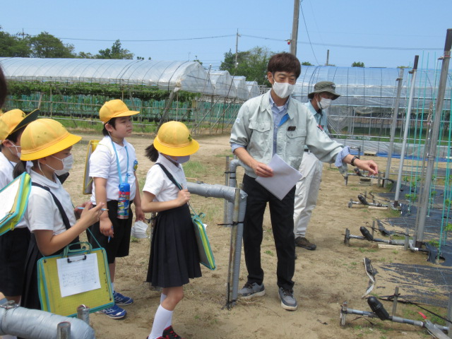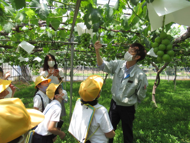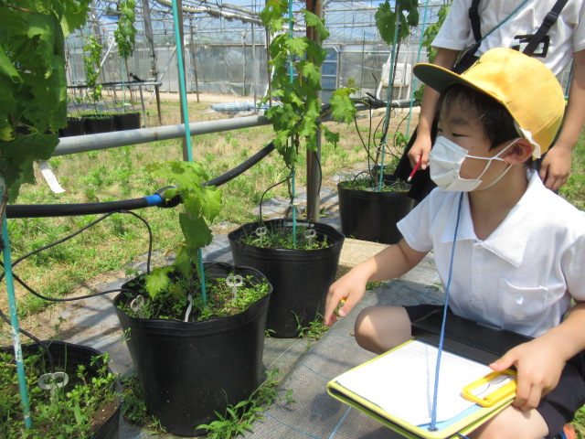 6月17日、砂丘地農業研究センターを見学してきました。 ビニールハウスなどを見せていただき、一本の木から伸びているツルの長さに子ども達はとても驚いていました。 小さな苗木が立派なルビーロマンを実らせるまでの説明を、子ども達は真剣に聞いていました。 かほく市の特産物を育てる苦労を学ぶことができました。