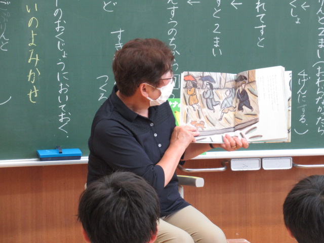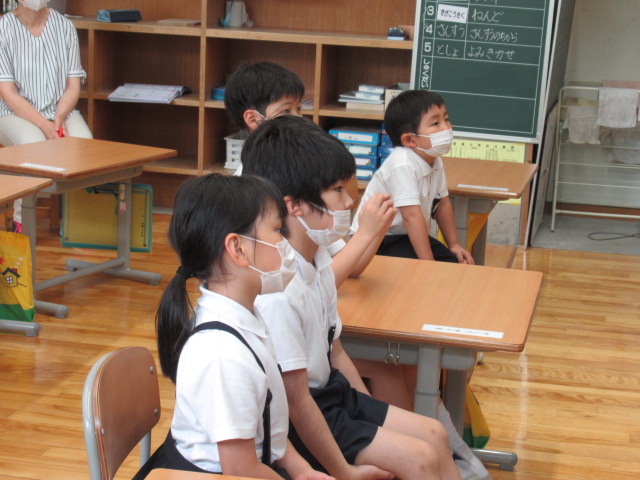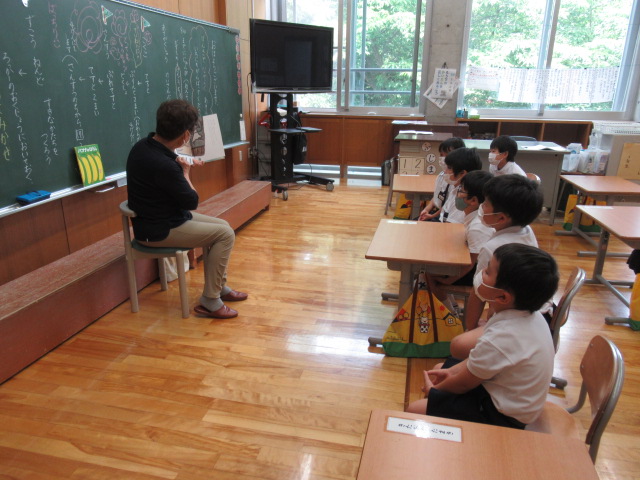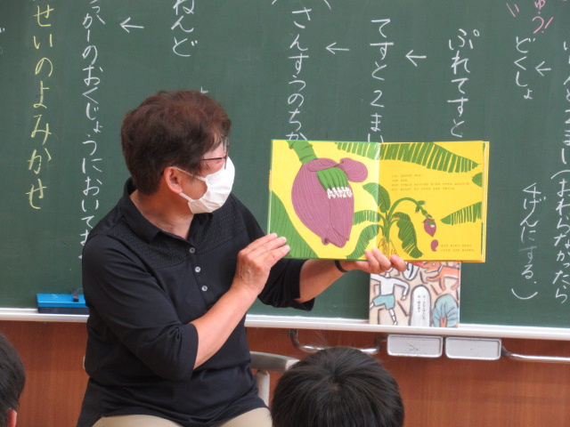 1年生が、松本多美子さんに読み聞かせをしてもらいました。今回は「バナナのはなし」と「あめあがり」。「バナナのはなし」ではバナナの生態がわかりやすく描かれており、1年生は「知らんかった!」「こんな風にバナナってできるんや!」など感心した声を上げていました。一転して「あめあがり」では、子ども達は静かに聞き入っていました。「あめあがり」は、家出した飼い犬が飼い主との思い出を回想していき、ラストでは再会します。松本さんが読み終わった後には、1年生から「ちょっと泣きそうになった」という感想が出ました。物語を聞く・理解する力が子ども達の中でしっかりと育まれている姿が見られました。